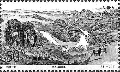 武夷山“奇秀甲东南”。1994年9月30日,中国邮政发行的《武夷山》特种邮票的第2枚“武夷山九曲溪”,这枚邮票将九曲溪设计成一幅“U”形画面,蜿蜒曲折,清澈萦回,两岸山峰树木争奇斗秀,色彩浓郁。人们在欣赏邮票的同时,仿佛能感受到那从九曲溪飘来的清凉水汽,令人陶醉。
