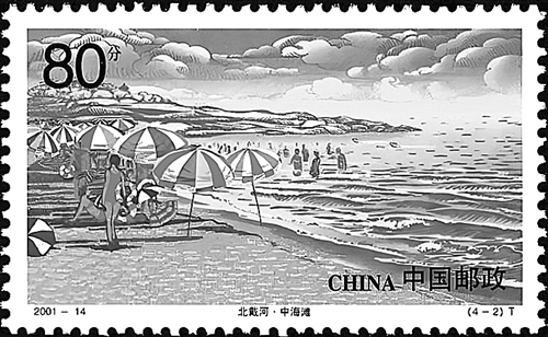 北戴河可谓我国最为著名的海滨避暑胜地。2001年8月5日,中国邮政发行的《北戴河》特种邮票的第2枚“中海滩”,邮票画面上,设计者采用浓浓的蓝色绘天、绘海,海天一色;采用彩色绘沙滩,绘游人,沙滩上一把把撑起的彩条遮阳伞,海水中人影憧憧,生动地展现出了一幅人与自然和谐相处的美妙景象。