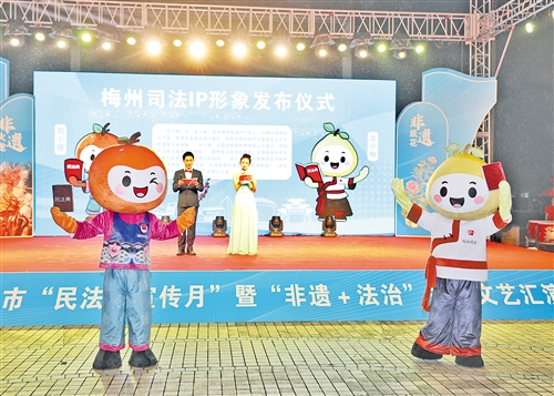 在2025年梅州市“民法典宣传月”暨“非遗+法治”主题文艺汇演上,梅州司法行政“代言人”——“司小橙”与“法小柚”正式官宣。市司法局相关负责人介绍说,梅州司法行政IP形象以梅州地理标志产品脐橙和金柚为设计雏形,巧妙地将民法典元素与客家本土文化相融合。其中,“司小橙”以脐橙拟人化设计,手持民法典与缀满梅花的枝丫,既呼应法典的权威性,又暗喻梅州司法行政人如寒梅般坚韧清正的品格;“法小柚”则以梅州金柚为原型,手握民法典,化身客家村落的“首席调解员”,传递“法理护民,公平如秤”的核心价值。