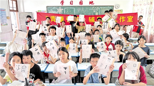 文学院“诗墨流光·智链非遗”社会实践志愿服务队走进丰顺县潭江中心小学,为六年级学生精心设计特色文化课程。“声动诗心 唱出诗意”古诗课引导学生吟唱经典、创作新歌,感受诗歌韵律;“探秘丰顺非遗”课堂图文并茂展示埔寨火龙、留隍云片糕等各级非遗项目,聚焦省级非遗埔寨纸花,讲述其自清乾隆以来的传承故事,并指导学生动手体验制作技法;书法课堂带领学生追溯汉字演变,体验文房四宝特性,在临摹与创作中感悟汉字文化底蕴。志愿者们以诗词、非遗、书法为桥,在少年心中播撒下文化自信的种子。
