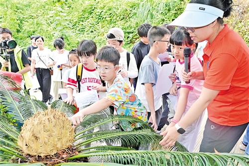 在自然科普导师带领下,小记者们化身“小药童”,沿着自然教育径线路开展丰富有趣的自然科普课程。他们一边聆听导师讲解,一边认真记录“自然笔记”。他们好奇地触摸着每一株植物,辨认着枇杷树、苏铁蕨、鬼针草等南药的形态、种类和功效,对南药的特性有了初步了解。此外,小记者们还充分发挥想象力和创造力,动手设计南药小IP、制作南药香囊,进一步加深了对南药的认识,从而认识植物对人类生存的重要性和生物多样性的重要性。