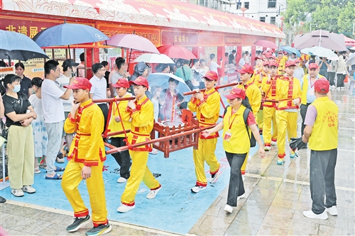 当天早上7时30分许,声势浩大的市级非遗项目“扛仙师”巡游率先登场。近300人的巡游队伍自仙师宫出发,沿杞溪广场、乐粤公祠、差干学校、善吉大道行进,最终抵达差干镇政府广场。巡游队伍所到之处,鞭炮齐鸣。在乐粤公祠和差干镇政府广场的定点展演中,刚劲的黄氏头部拳、灵动的传统舞狮赢得现场观众喝彩声不断,平远上岃山歌的悠扬旋律更为巡游增添动人韵味。据悉,当地“扛仙师”民俗可追溯至北宋政和二年(1112年),盛行于粤闽赣边区,承载着民众对“风调雨顺、国泰民安”的美好祈愿。