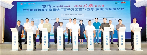 本报讯 8月14日,由梅州市政府主办、五华县政府与梅州市商务局承办的广东梅州招商引资推进“百千万工程”·五华(苏州)专场推介会在江苏苏州举行(如上图)。推介会以“智造五华新机遇 链动共赢长三角”为主题,现场签约项目16个、计划投资总额23.2亿元,为五华智能制造产业发展按下“加速键”。