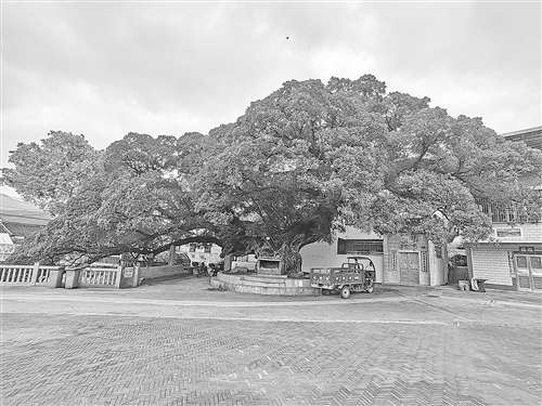 老榕树位于高思中心屋汤氏祖祠前。瞧,眼前古树冠如巨型华盖,叶子苍翠欲滴,树下一红色小屋(内置神龛),侧后方建一“古榕别墅”。小广场上的说明牌写着:古榕树龄达600余年,属桑科榕属乔木,树高10米,胸围8.4米,平均冠幅23米,为国家一级古树。邑人曾有诗颂曰:华盖擎云耸半空,虬枝茂叶斗寒风。荫凉难得闲聊处,世事沧桑笑谈中。这棵古榕树是高思汤氏民众割不断的乡愁和美好的印记,于2022年入选“广东十大最美古树”。