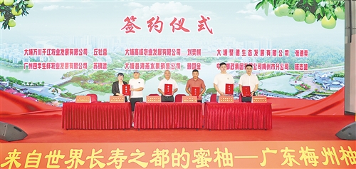 9月15日,“2025年梅州柚(大埔蜜柚)开采活动暨销售推介会”在青溪镇溪口村高峰农业蜜柚种植基地举行。活动现场,6组蜜柚企业与经销商完成签约,合作范围涵盖种植、加工、物流等多个环节——大埔高峰农业与广东碧乡科技签下年度采购协议,广东碧乡科技将采购100万斤蜜柚供应华润万家;大埔县蜜柚行业协会与多家物流企业达成合作,确保蜜柚运输高效畅通。“我们和大埔蜜柚合作四年了,这里的蜜柚皮薄、肉嫩、汁多,还富含硒元素,特别受欢迎,今年肯定能卖得更好。”广东碧乡科技销售总监侯敬辉说。