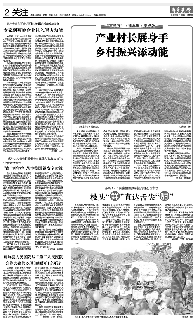 截至目前,蕉岭全县蜜柚种植面积约1.4万亩,主要种植有白肉蜜柚、红肉蜜柚、三红蜜柚等品种,年产量约4.2万吨,总产值超1.17亿元。接下来,蕉岭县将依托优越的生态环境和气候条件,大力提升蜜柚种植管理水平,加强品质宣传和产销对接,做好做优“土特产”文章,积极推动蜜柚产业向规模化、标准化、品牌化发展,赋能“百千万工程”。