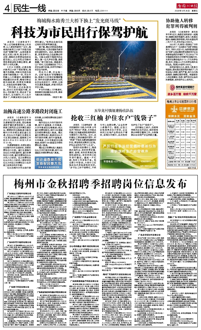 本报讯 (记者陈坚平)“晚上过马路能看到地上的光带,让人感到很新奇!”近日,梅城梅水路秀兰大桥下的斑马线完成“智慧升级”,全息投影系统正式投入使用,每当有行人过街,清晰的光带便会投射在斑马线上,这让市民过马路时更容易被途经车辆注意到,赢得不少市民点赞。