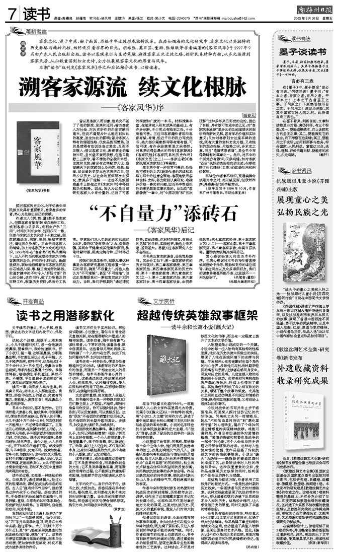 曾以是客家人而自豪,但终究不甚了了他的源流、发展和延衍;曾为客家人对社会、对历史所作的杰出贡献而高兴,但说不清楚为什么能达到如此的高度,发生如此的影响;曾为客家人特有的倔强性格、优良品质而赞美,但总是觉得有些说法言过其实,反而不足服人;曾以客家文化、教育事业的蓬勃兴旺,且长盛不衰而欣慰,但也只能数二三家珍,看不清他的全貌和本质,主流和支流;曾以有这样勤劳无比、盛誉满天下的客家妇女为光荣,祖辈、母辈、姐妹辈的英姿本色常历历在目,但很少从历史、从社会的更深层次去探究,赞美多于理解……这些不足或困惑基本上都在这本《客家风华》中得到解决和解释。因此,我认为这是目前研究客家人中有分量的、达到了可喜的深度和广度的一本书。材料搜集丰富,在继承前人研究成果的基础上,有许多创新,不少观点有独到之处,十分难能可贵。三位非客家籍作者因与客家有缘、有情,经近千日的努力写成此书,绝大部分篇章都写得有理有据,可信可读,有许多段落更是文采斐然。对我来说得益最大的则有《客家源流》《客家民性》《客家民系的历史作用》《客家文艺(之二)——客家山歌》《客家民居》《客家妇女》等篇章。