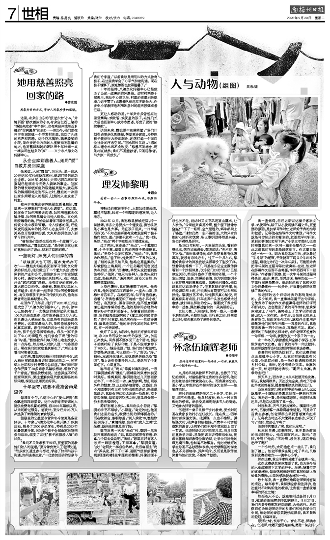 伍老师一辈子扎根于乡村教育,更长时间是在我家乡的村小担任校长。他在我三、四年级时教我语文课。他讲课一点也不枯燥。讲解课文时,他声音抑扬顿挫,严肃中不时穿插幽默的语言,让同学们在不知不觉间就上完了一节课。伍老师语文知识功底扎实,而且非常注重教学方法,总是把课文讲得鲜活生动,把语文基础知识教得全面透彻,让学生们对他的课充满兴趣,也丝毫不敢懈怠。他对成绩好的学生总是不吝鼓励和表扬,对成绩稍差的学生也从不另眼相待、厉声呵斥,反而总是诙谐地笑着与他们交流,不断给予鼓励。