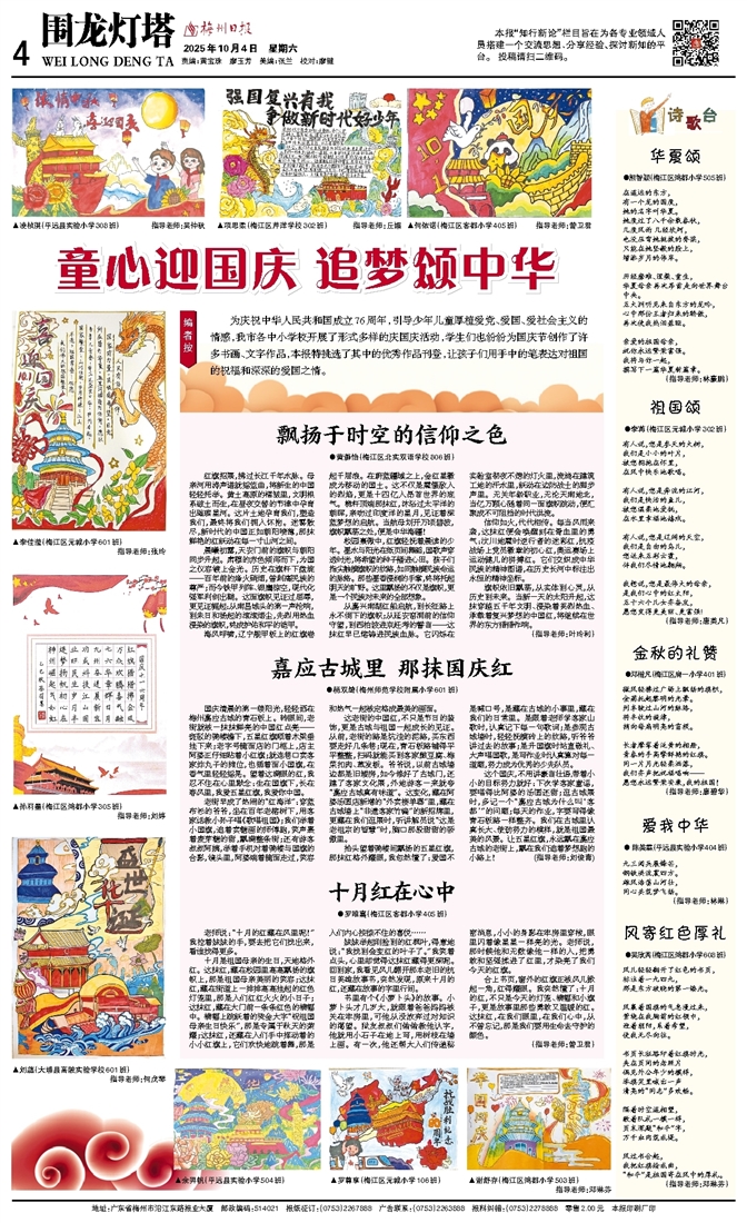 华夏颂 ●熊智颖(梅江区鸿都小学505班) 在遥远的东方, 有一个龙的国度, 她的名字叫华夏。 她度过了八千余载春秋, 几度风雨 几经坎坷, 也没压弯她挺拔的脊梁, 只能在她坚毅的脸上, 增添岁月的伟岸。 历经磨难、涅槃、重生, 华夏母亲再次昂首走向世界舞台中央。 五大洲听见来自东方的龙吟, 心中那份王者归来的骄傲, 再次使我热泪盈眶。 亲爱的祖国母亲, 祝你永远繁荣富强。 我将与你一起, 撰写下一篇华夏新篇章。 (指导老师:林豪鹏) 祖国颂 ●李苒(梅江区元城小学302班) 有人说,您是参天的大树, 我们是小小的叶片, 被您拥抱在怀里, 在风中快乐地歌唱。 有人说,您是奔流的江河, 我们是快活的鱼儿, 被您温柔地爱抚, 在水里幸福地嬉戏。 有人说,您是辽阔的天空, 我们是自由的鸟儿, 您送来五彩云霞, 伴我们尽情地翱翔。 我想说,您是最伟大的母亲, 是我们心中的红太阳, 五十六个儿女齐奋发, 愿您变得更美丽、更富强! (指导老师:唐英凡) 金秋的礼赞 ●邓楷凡(梅江区肩一小学401班) 微风轻拂过广场上飘扬的旗帜, 金菊托起黎明的光晕。 列车驶过山河的脉络, 将丰收的旋律, 捎向每扇明亮的窗棂。 长者摩挲着泛黄的相册, 青春的手高擎鲜艳的红旗。 同一片月光轻柔洒落, 我们齐声把祝福唱响—— 愿您永远繁荣安康,我的祖国! (指导老师:廖碧华) 爱我中华 ● 陈美霖(平远县实验小学404班) 九三阅兵展锋芒, 钢铁洪流震四方。 雄风浩荡山河壮, 同心共筑梦飞扬。 (指导老师:林琳) 风寄红色厚礼 ●吴欣芮(梅江区鸿都小学608班) 风儿轻轻翻开了红色的书页, 标注着一九四九, 那是东方破晓的第一缕光。 风裹着国旗的气息漫过来, 萦绕在我胸前的红领巾, 迎着朝阳,系着希望, 使我无尽向往。 书页长征路印着红旗时光, 夹在页间的老照片 偶见外公年少的模样, 举旗笑里喊出一声 清亮的“同志”多欢畅。 隔着时空遥相望, 敬着队礼一模一样, 页末深题“和平”字, 万千血肉筑成堤。 风过书合起, 我把红旗绘成曲, “和平”是祖国寄在风中的厚礼。 (指导老师:邓琳芬) | |