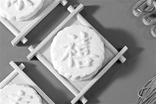 月光糕(也称白切糕):白色糯米粉皮包裹上下两层,中间夹着由冬瓜条、黑芝麻、花生仁配制的馅料,口感软韧香甜,老少皆宜。最令孩童难忘的是外包装上嫦娥奔月的图案,充满童话色彩。