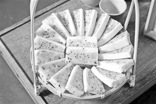敛粄:以往附城一带年节常做。用粘米粉(俗称“滞”)混合芝麻、花生和白糖拌匀,装入金属模具,加盖压实脱模后蒸熟。成品色泽洁白,表面嵌着花生芝麻,状如水磨石。因是干粉胚蒸制,靠蒸汽渗透,口感不如常规粄食嫩滑,略带粗糙感(客家话形容为“糠梗鸡”),不太受孩子欢迎,其淡出节日粄食系列也在情理之中。