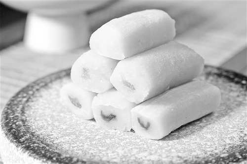 猪肠糕:形似猪肠的长条糕点,糯米粉外皮包裹着香甜的黑芝麻馅料。