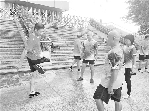 “我最开始接触踢毽子是2005年,当时是出于健康考虑。”回忆起与毽子的初遇,侯经智告诉记者,因为他颈椎、腰椎不舒服,考虑到踢毽子需要协调全身、能拉伸筋骨,他便以锻炼身体的心态,学习南派花毽的踢法。据介绍,南派花毽的过毽花式,是以人为中心,上贴下空,右边过左边,左边过右边,前过后,后过前。一开始,侯经智连毽子都接不住,踢几下就掉。经过每天花时间压腿、训练,如今他已能连续踢毽百次不落地,更能灵活运用脚后跟将毽子从左后侧经脚弓踢至右前侧,再反踢至身后;或是用脚背轻颠毽子数下缓冲,转而用膝盖将毽子弹击出多变的弧线……他边示范边说:“要想毽子听话,就要像带孩子一样带它,所以我每天都压腿、踢毽子,现在脚筋完全放松,高难度动作也能轻松完成。”毽子成了他生活里雷打不动的“老伙计”,哪怕工作出差,他的行李箱里也会给毽子留个位置,到了地方找块场地踢上一会儿才觉得踏实。为了精进技艺,他还拜师广州市毽球协会花毽委员会主任龙荣波,除了现场交流外,还通过线上将自己踢毽子的视频发给他接受线上专业指导,不断提升自身踢毽子的技巧。