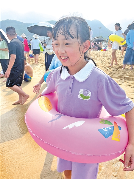 来到大梅沙,玩水自然是必不可少的重头戏。我套上色彩斑斓的游泳圈,缓缓走进海里。海水凉凉的,起初我还有些胆怯,像一只受惊的小鸟。但在海浪温柔的推动下,我渐渐适应了海水的浮力,开始尽情享受在海里漂浮的惬意感觉。我迎着海浪,一步一步勇敢地向大海深处迈进,感受着海浪强大的冲击力。有时候,海浪如同一头凶猛的野兽,将我整个淹没,那一瞬间,我被海水紧紧包围,耳朵里只剩下“轰隆隆”的海浪声和自己剧烈的心跳声,紧张与刺激交织在一起,让我欲罢不能。