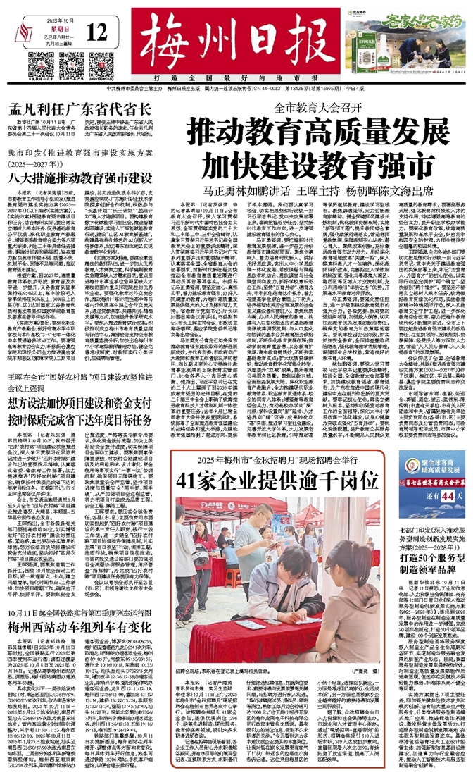 本报讯 (记者郑炜梅 通讯员魏倩娥)自2025年10月11日零时起,全国铁路实行2025年第四季度列车运行图,调图过渡期为2025年10月8日至2025年10月14日。记者从高铁梅州西站获悉,调图后,梅州西站满图办理旅客列车85趟。