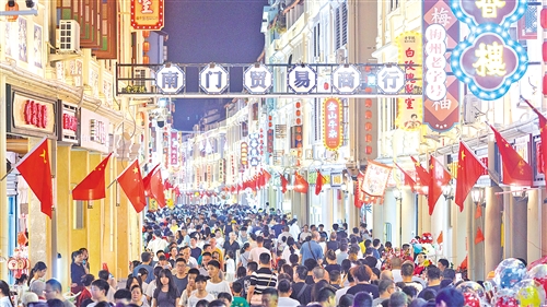 除了精彩的演出,古城内的客家特色体验同样人气爆棚。售卖猪肠糕、南瓜圆、炸馓子等客家传统糕点的商店香气四溢,店铺前排起了队;洪屋雪花冰室等网红店里座无虚席,年轻人纷纷前来打卡。文创产品店内更是人头攒动,以梅州标志性建筑和客家方言制成的冰箱贴、发粄月饼礼盒、蒜蓉辣酱公仔、透光书签、柚子茶宠等文创产品更是深受追捧。这些文创产品将客家文化元素与现代审美巧妙结合,吸引游客驻足挑选,为旅程留下独特的客家印记。“我们持续在文创产品设计上迭代升级,每一件都是精心雕琢的‘梅州礼物’。”客都文创产业孵化(梅州)有限公司、自柚生长品牌负责人庄映萍表示,“双节”期间,入店选购的游客络绎不绝,希望以文创为媒,吸引更多人了解梅州、走进梅州。
