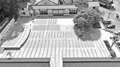 除了仁居镇,八尺镇进士广场、县人民广场等公共区域,也成了农户们的“临时晒谷场”。在八尺镇进士广场,几位农户分工合作,有的铺谷、有的翻晒,广场上一派忙碌又和谐的景象。