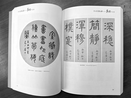 他的书法根植于汉魏。隶书稳厚,落笔松秀,偶带篆意及木简行书点画,庄中有谐,端凝流便,及时穿插涩笔,调节气氛。苦觅元神旺炽的民间书法仙乳,显示丘壑及旷远风骨。虽欠老拙深涵,然方向正确,奠基扎实,把握了相对的自由。多思而不迟疑,求美首尊质朴。楷书里保留三四成隶法,遥师钟繇,融入魏碑。端穆矜重,古丈夫衣冠,当代人襟怀,运毫沉着,积之以岁月,还能开拓出灵动之趣,为篇章点睛。章草是极难把握又富于潜力的书体,两千年来未脱稚气,问津者少。他仰慕罗复堪、王蘧常的耕耘,但读而不临,会其意便休,仍从先哲作品悟到原旨。方笔为主,锐钝随缘,不鼓努为力,逞姿为媚。二十世纪高手无多,纷纷谢世,章草及带简味隶书存世已无大师,奋进中的强大对手为数有限。他对方笔驾轻就熟,底气较为充沛。即或成功之后尝到武松打“狗”的寂寞与乏味,也该全心突破,为三十年后艺坛展示“少数民族”的生命力,宁非韵事?他的行草书气息薄于隶楷,颇思写得回环狂舞,跳宕奔腾。才华、想象、浪漫主义的翅膀摆脱拘谨,熟后返生,入法出法,自我作古,师心意造,书内书外,还有一段艰险的路要攀登。艺海无涯,无奈浮生有大限。艺兼众美是理想,各书体间可以互相促进。冲刺两种,带动若干次要写法,量体裁衣,要慎重思考选择。于右任、鲁迅仅写一体,并不单调,以深见宽,一样峰回路转、摇曳多姿。
