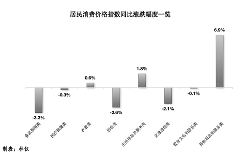 分类别看,CPI八大类商品(服务)价格环比呈“4涨1平3降”态势。其中,其他用品及服务价格上涨1.2%,居住价格上涨1.0%,生活用品及服务价格上涨0.5%,衣着价格上涨0.3%;医疗保健价格持平;教育文化娱乐价格下降0.8%,食品烟酒和交通通信价格均下降0.4%。