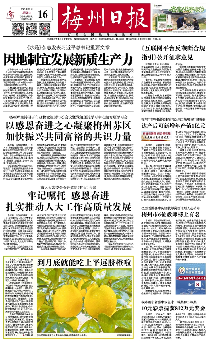 与此同时,平远县农业农村部门的专家也将“科技课堂”搬进了脐橙果园,指导果农在采收保鲜关键期严把品质关、做到科学采收。“一是控水停灌,避免影响糖度积累;二是停止用药,确保农残检测达标;三是标记黄龙病株,利用当前转色差异识别病树,采后及时清除补种。”高级农艺师林捷新告诉记者,“预计今年平远脐橙总产量与往年持平,甜度在12左右,到本月底平远脐橙品质将达到最佳。”