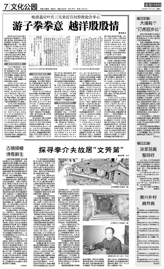 目光重新落在院子里的杂草和酥化的墙体上,笔者心里沉甸甸的。同镇的东皋公祠,原是梅西区苏维埃政府旧址,修好后成了展示石坑人民革命斗争史的重要窗口;洪秀全祖居梅魁第,也成了讲述太平天国运动和洪氏家族渊源的好去处。可文芳第呢?若任由风雨侵蚀,李介夫“弃业归国救国”的故事,李祯荪“战地诗人”的传奇,或许再过十几年,就只有老一辈人还记得了。