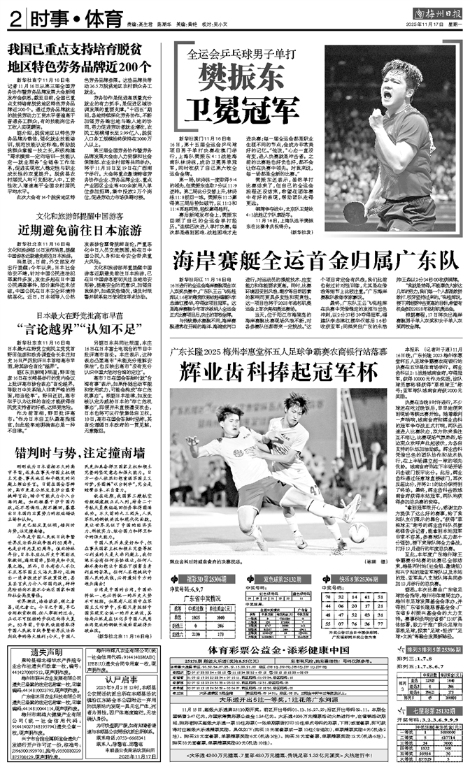 新华社阳江11月16日电 16日进行的全运会海岸赛艇混合双人双桨决赛中,广东队王云飞/张桂萍以1.6秒的微弱优势战胜福建队李志津/江樱华,夺得该项目冠军。这是海岸赛艇今年首次被纳入全运会正式比赛项目后,决出的首枚金牌。