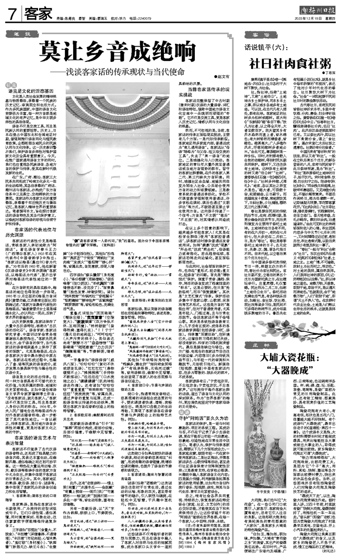 语言是文化的活态传承。任何一种方言都具有不可替代的文化价值,与其所属的群体、地域和历史紧密相连。正如中国台湾语言文学界专家罗肇锦博士所言:“没有客家话,就无客家人。”客家话不仅是交际工具,而且是客家人身份认同的标志。1956年,中央人民广播电台选用梅县话作为对外客家话播音标准,进一步彰显了其代表性地位。一言以蔽之,传承客家话,是对地方语言多样性的尊重,更是对客家文化之根的守护。