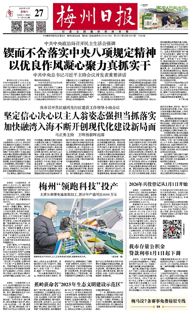 本报讯 (记者郑炜梅 通讯员李洋)近日,市征兵办发布梅州市2026年兵役登记通告。通告显示,梅州市2026年兵役登记工作将于2026年1月1日正式开始,登记时间持续至10月31日。