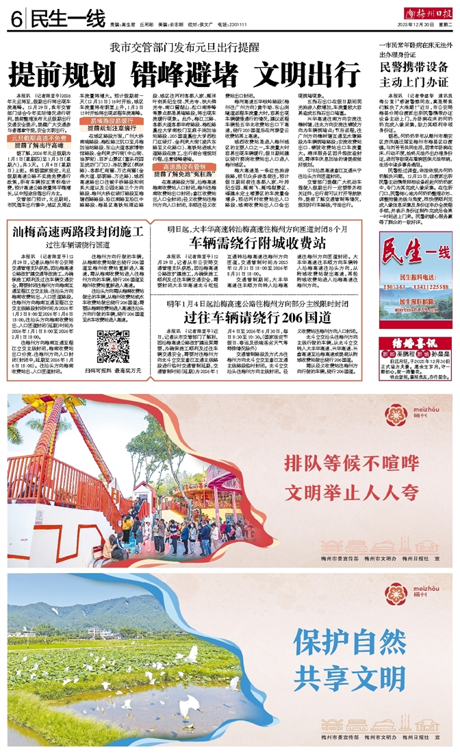 本报讯 (记者陈坚平)2026年元旦将至,假期出行将出现车流高峰。12月29日,我市交管部门结合今年实际情况进行研判,提前整理发布元旦假期出行交通安全提示,提醒广大交通参与者遵章守规,安全文明出行。