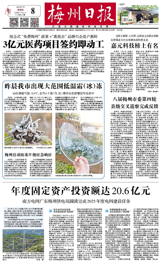 本报讯 (记者李艳良)记者从市气象局获悉,1月7日早晨,我市出现大范围低温霜(冰)冻,山区最低气温-5.6℃(蕉岭南磜)。