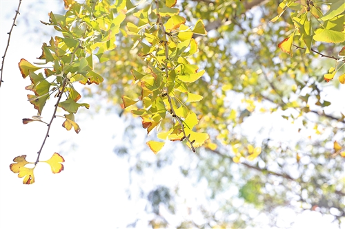 又是一年春。这一年,银杏树长出了很多的叶子,一树“蝴蝶”迎着风长大,舒展,轻舞。那一年秋天,我看到了银杏树由绿变黄的全过程。时光的脚步匆匆,它却不慌不忙,像一个很有耐心的画师,井然有序地进行着变色彩绘。它把色彩一点点地铺开,小心地调色,然后涂抹在每一片叶子上面。这里几笔,那里几笔,一会儿涂在叶子边缘,一会儿抹在叶子中间,形成斑斑点点、错落有致,层层叠叠的青黄色彩。它不急,时不时想几下又添上几笔,青黄变明黄,明黄变橙黄,橙黄变金黄。