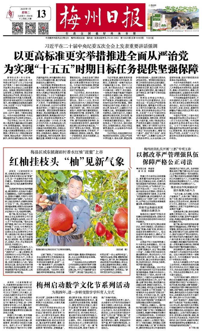 本报讯 (记者吴丽伶)日前,在梅县区城东镇谢田村,一款红色果皮的香水红柚“甜蜜”上市,在一片金黄色的柚子中格外醒目。凭借独特外观和清甜口感,香水红柚迅速赢得消费者青睐。
