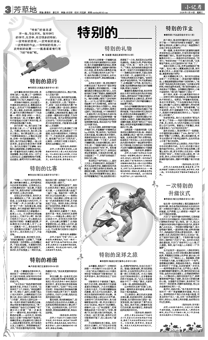 “特别”的意思是不一般,与众不同。在同学们的学习、生活中,有过很多的特别:一段特别的旅程,一次特别的发现,一次特别的作业,一件特别的礼物,一次特别的比赛……一起来看看他们笔下的“特别”吧。