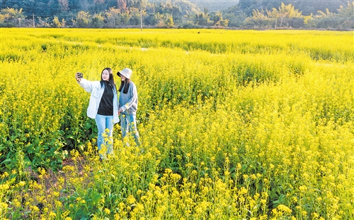 走进悦来村油菜花种植基地,只见金灿灿的花海铺满田野,与绿水青山相映成趣,构成一幅生机盎然的乡村画卷。市民游客漫步花海之中,或拍照留念,或驻足欣赏,尽情享受美好时光。“这里的油菜花一大片,景色太美了!”市民李先生兴奋地说:“趁着天气晴好,我约了几个朋友来赏花打卡,大家玩得特别开心。”