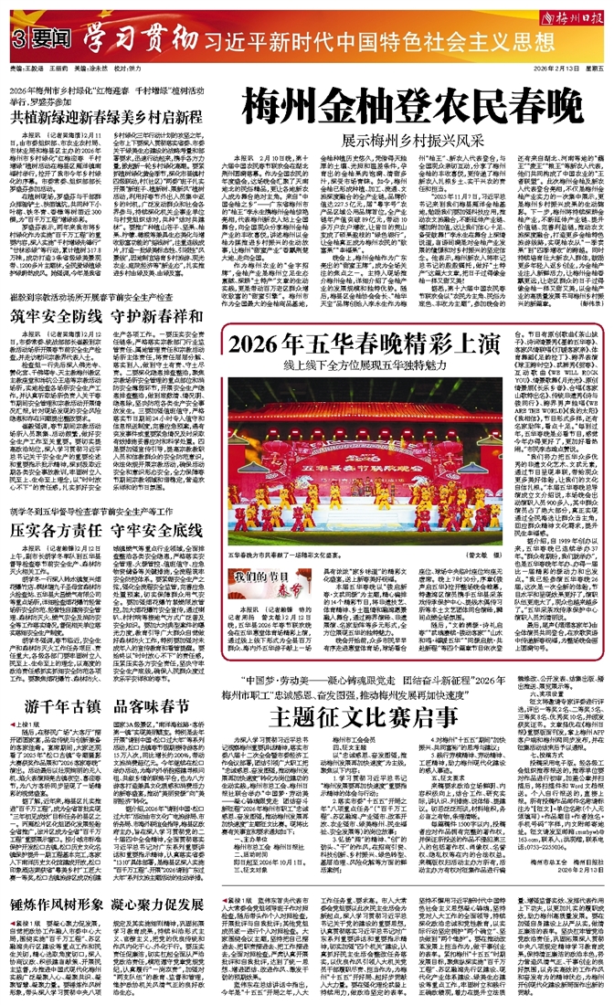 本报讯 (记者赖锋 特约记者周扬 曾文敏)2月12日晚,五华县2026年春节联欢晚会在五华惠堂体育场精彩上演,通过线上线下形式为全县百万群众、海内外五华游子献上一场具有浓浓“家乡味道”的精彩文化盛宴,送上新春美好祝福。