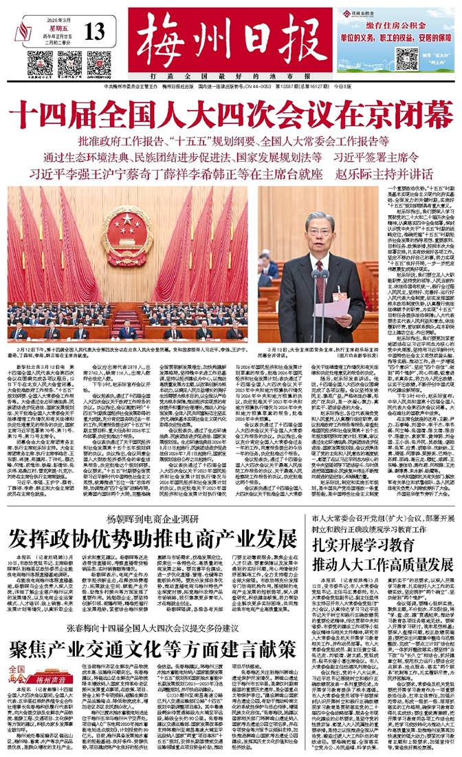 本报讯 (记者赖锋)十四届全国人大四次会议期间,全国人大代表、五华县红根然养殖专业合作社理事长张春梅积极履行代表职责,向大会提交涉及生鲜农产品物流、能源工程、交通项目、文化保护等方面的建议,积极为家乡发展事业鼓与呼。