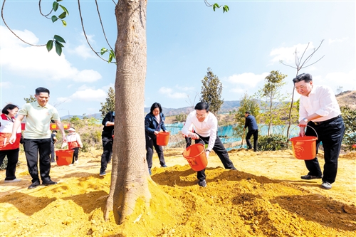 活动现场,800多人分工协作、有条不紊,扶苗校准、培土夯实、提桶浇灌,认真落实义务植树每一道工序,共同栽下闽楠、沉香、红锥、火力楠等乡土珍贵树种2000多株,以实际行动厚植生态本底、筑牢生态安全屏障,充分彰显了全市上下大力推进绿美广东生态建设的坚定决心与行动自觉。新栽苗木迎风挺立、错落有致,与近年来栽下的“国防林”连片成面,为梅州大地再添一片新绿。