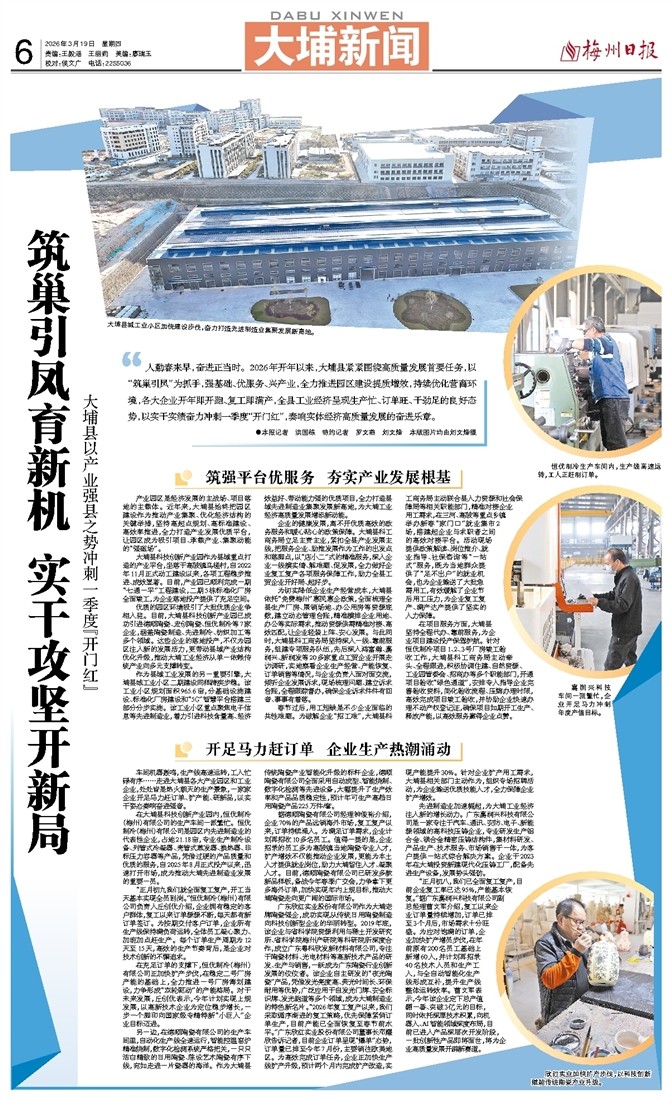 人勤春来早,奋进正当时。2026年开年以来,大埔县紧紧围绕高质量发展首要任务,以“筑巢引凤”为抓手,强基础、优服务、兴产业,全力推进园区建设提质增效,持续优化营商环境,各大企业开年即开跑、复工即满产,全县工业经济呈现生产忙、订单旺、干劲足的良好态势,以实干实绩奋力冲刺一季度“开门红”,奏响实体经济高质量发展的奋进乐章。