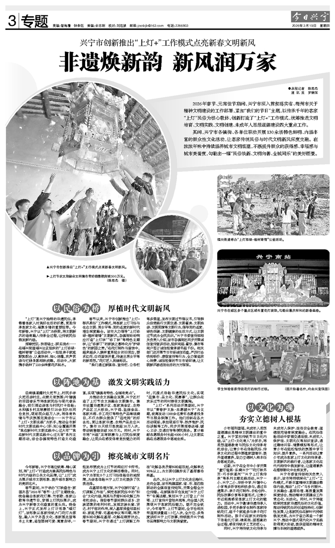 2026年春节、元宵佳节期间,兴宁市深入贯彻落实省、梅州市关于精神文明建设的工作部署,紧扣“我们的节日”主题,以传承千年的客家“上灯”民俗为核心载体,创新打造了“上灯+”工作模式,统筹推进文明培育、文明实践、文明创建、未成年人思想道德建设四大重点工作。