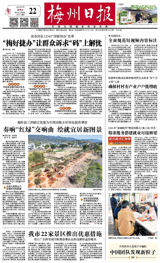 本报讯 (记者严海苑)为贯彻落实“百万英才汇南粤”行动计划,实施“才聚梅州大行动”,持续深化“青梅有约·智汇梅州”人才周品牌建设,3月21日,第二届人才周系列活动之2026年“春暖梅州”现场招聘会(第三场)在梅城世界客商中心(市人力资源市场)举办,35家企业进场提供1415个岗位。本场招聘会同步开展重点群体促就业专项行动职业指导讲座,以精准服务搭建就业对接桥梁。