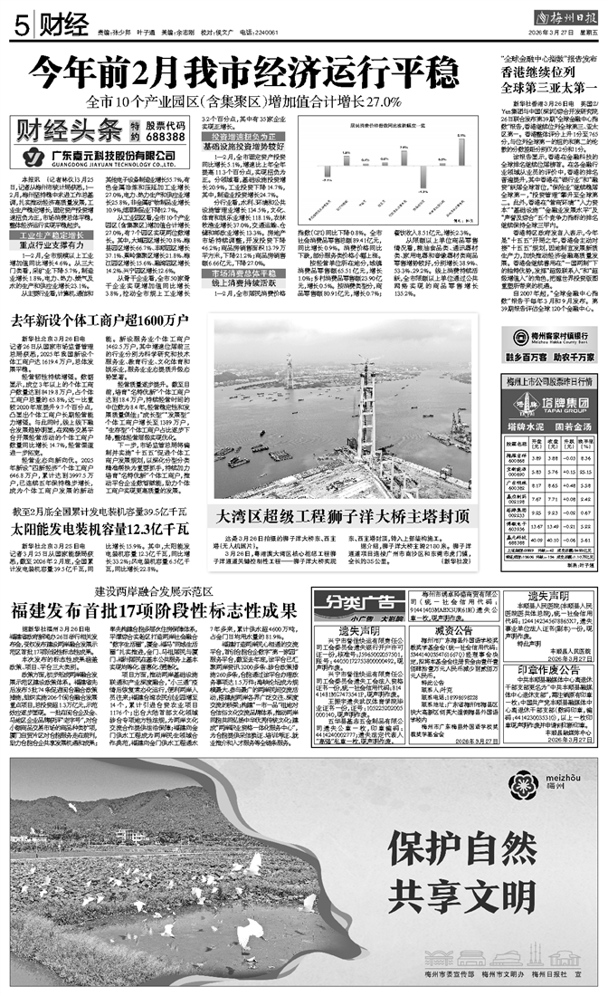 本报讯 (记者林仪)3月25日,记者从梅州市统计局获悉,1—2月,梅州坚持稳中求进工作总基调,扎实推动经济高质量发展,工业生产稳定增长,固定资产投资增速扭负为正,市场消费总体平稳,整体经济运行实现平稳起步。