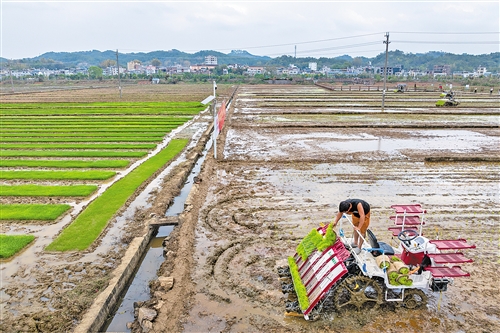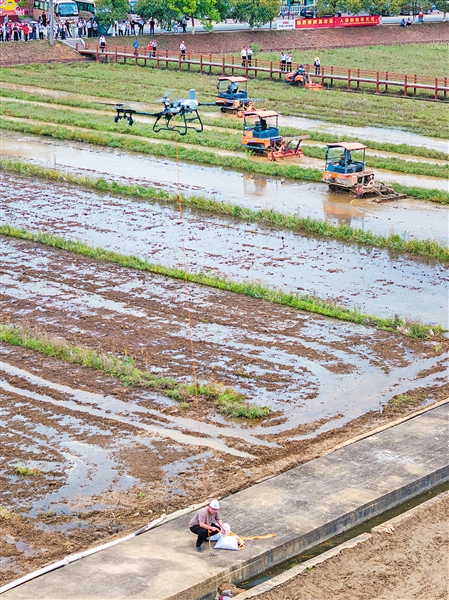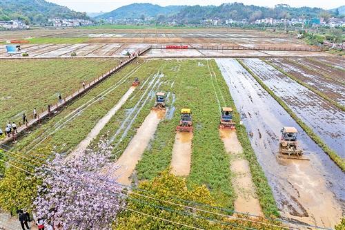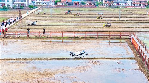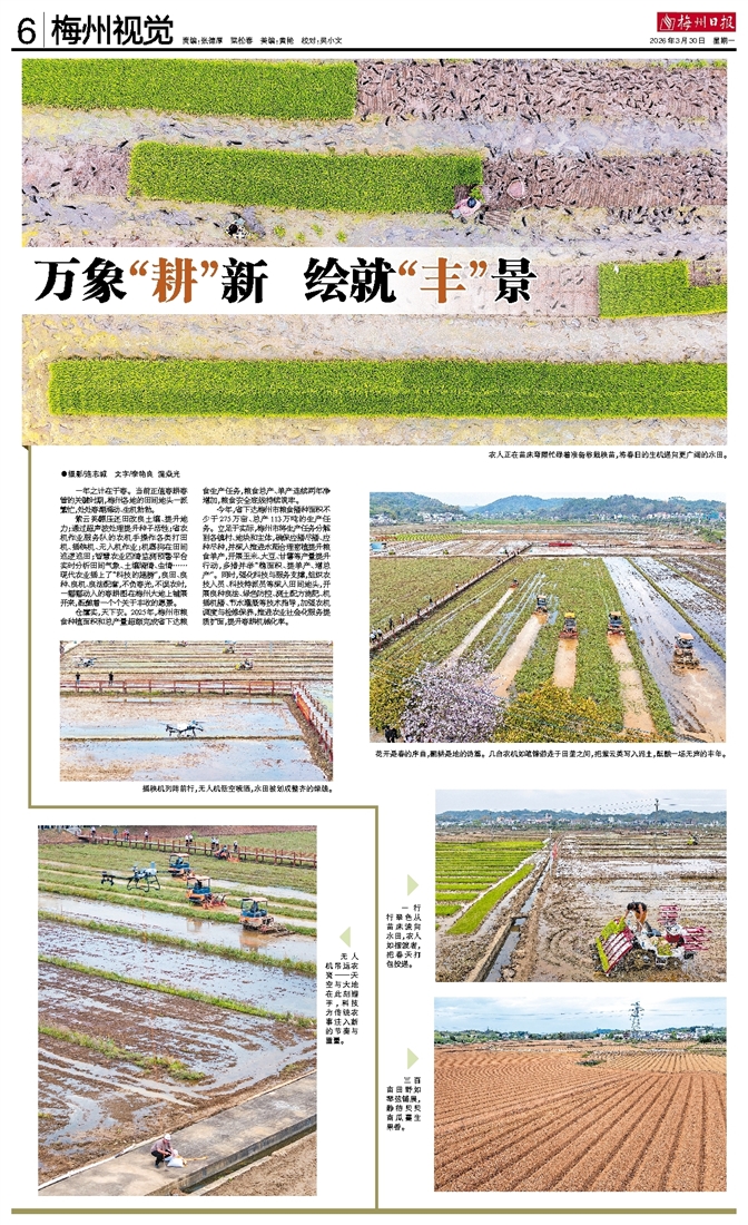 紫云英翻压还田改良土壤、提升地力;通过超声波处理提升种子活性;省农机作业服务队的农机手操作各类打田机、插秧机、无人机作业;机器狗在田间巡逻巡田;智慧农业四情监测预警平台实时分析田间气象、土壤墒情、虫情……现代农业插上了“科技的翅膀”,良田、良种、良机、良法配套,不负春光,不误农时,一幅幅动人的春耕图在梅州大地上铺展开来,酝酿着一个个关于丰收的愿景。