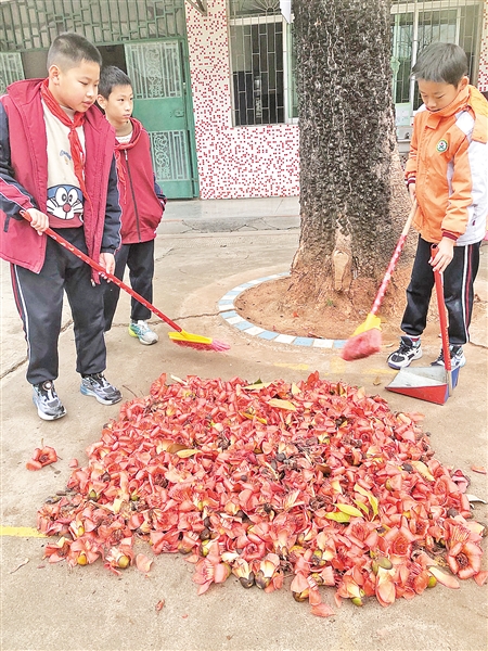 三月的校园,木棉争艳,生机盎然。几场春雨过后,火红的木棉花纷纷落下,像铺上了绚丽的地毯。清晨,早到的孩子们在清扫落花,虽扫去了眼前的美景,却让校园变得干净整洁。原来,真正的美,不只在花开花落间,更在孩子们辛勤劳动的身影里! (陈柳)