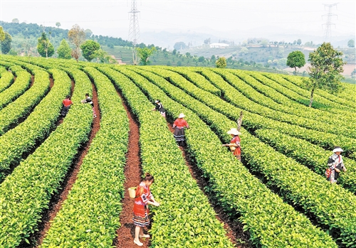 3月28日,茶农和游客在云南省普洱市思茅区倚象镇茶园共同采摘春茶(无人机照片)。