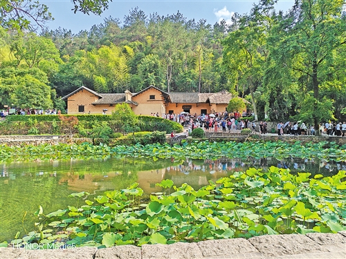 韶山冲是湖南省韶山市的一个山谷地带,毛泽东故居就坐落在山峦脚下,背靠青山,被青山绿水拥抱着,明堂旷远;门前水塘清澈见底,山林、故居、人群倒映在水塘中,如一幅动态水彩画;一片荷塘亭亭玉立,花蕾含苞欲放,呈现出淤泥不染的高洁气质。这里因独特的地貌著称,更因是毛泽东主席的故乡而闻名于世。“韶山”这地名源自一个美丽的传说:相传四千多年前,舜帝南巡至此,演奏韶乐,引来凤凰起舞,此地因而得名“韶山”,这片山谷也就被称为“韶山冲”。此处绿影婆娑,风景秀丽,环境清幽,空气清新。
