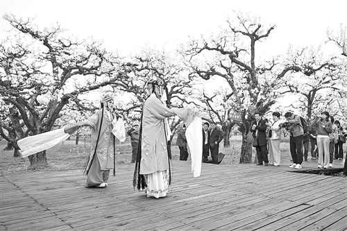 3月30日,游客在砀山县梨树王风景区观赏表演。
