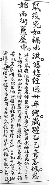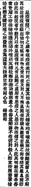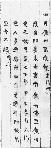 《湘报》第九十九号亦载其事:“甲午之岁,粤垣疫症流行,死亡无算。其始各大宅及铺家均有硕鼠无故倒毙堂前……鼠毙后即秽臭难堪,若弃之街巷,则其气息病即由此而起。”此疫自广州蔓延,渐及华南诸省,南方多地“十室九空,村落萧疏,生者流离,死者枕藉”,其惨烈之状,可想见之。