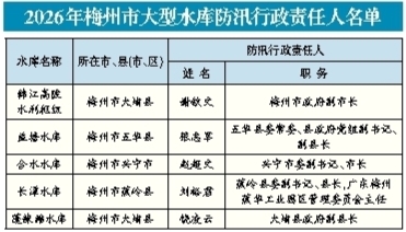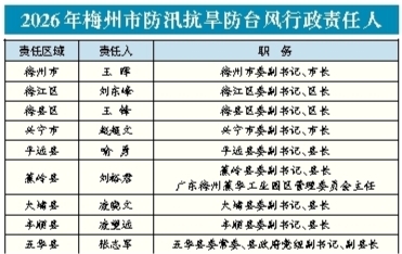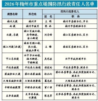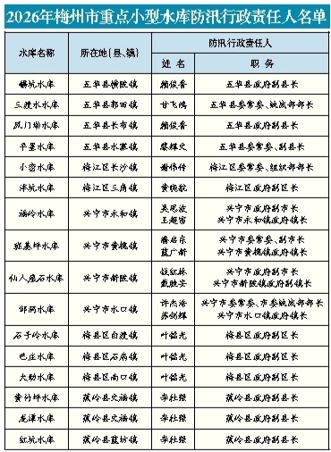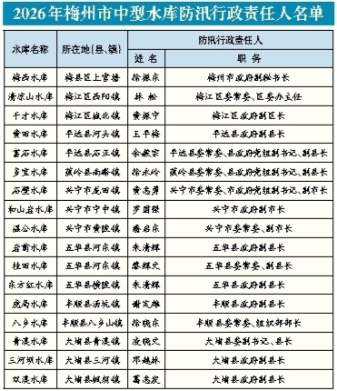 为切实做好2026年我市三防各项工作,进一步强化三防责任落实,根据《中华人民共和国防洪法》《中华人民共和国防汛条例》《中华人民共和国抗旱条例》《广东省防汛防旱防风条例》有关规定,现将我市2026年市、县三防行政责任人和大中型水库、重点堤围、重点小型水库防汛行政责任人名单在梅州日报上向社会公布,请各级行政责任人及时上岗到位,切实履行职责,组织落实各项防汛防旱防风措施,最大限度降低灾害风险,全力以赴保障人民群众生命财产安全。