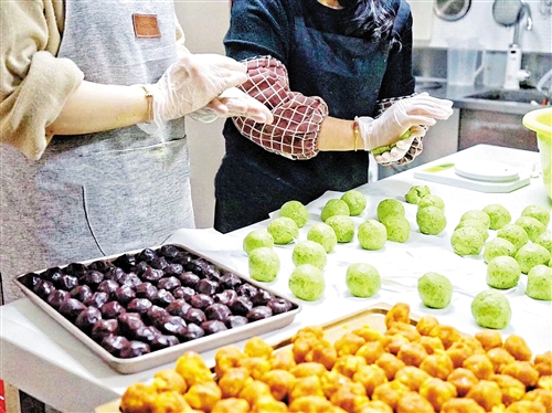 传统滋味历久弥香,创新青团也备受年轻食客追捧。梅城甜品店仨宝每年3月初就开始制作青团,店长肖冬莹说:“我们选用乡下的土艾叶,整株使用,香味更浓郁。”店里推出咸蛋黄肉松、豆沙、芋泥三种口味,其中咸蛋黄肉松味最受消费者欢迎。